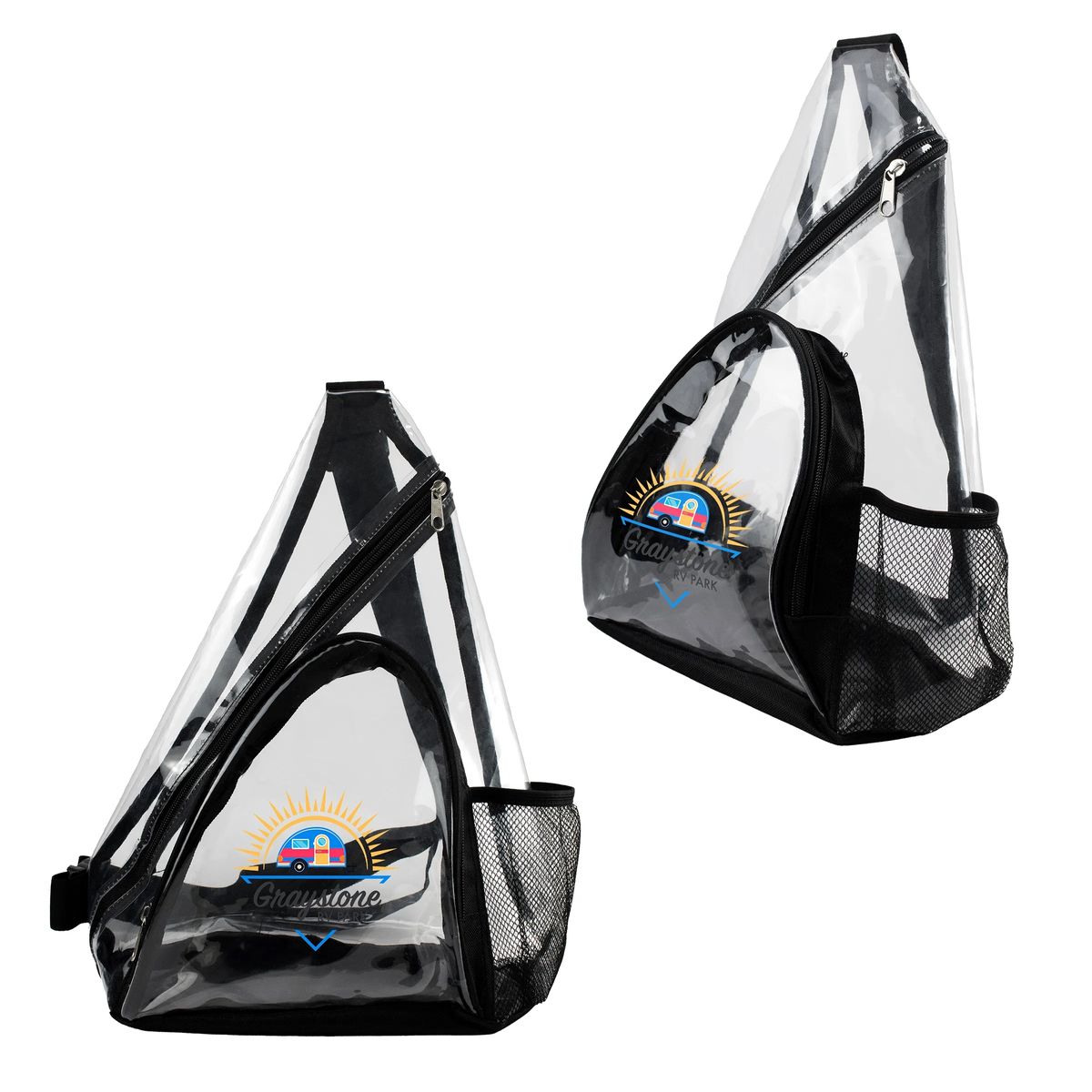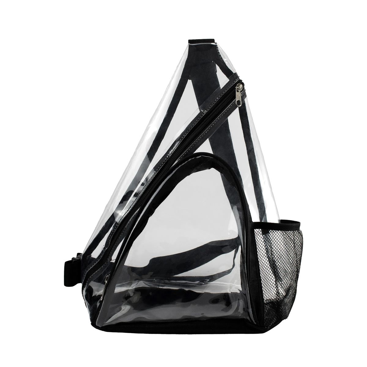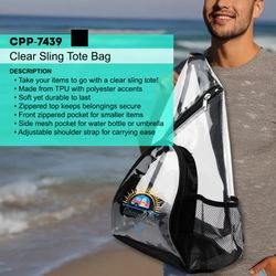 Easily transport your belongings on the go with our stylish clear sling tote! Crafted from durable TPU material with sleek polyester accents, this tote is both fashionable and practical. Plus, it's PVC free, making it an eco-friendly choice. The zippered top ensures your items stay secure while the front zippered pocket is perfect for storing smaller essentials. Stay hydrated on the move with the convenient side mesh pocket, ideal for a water bottle or umbrella. And with an adjustable shoulder strap, carrying your belongings has never been easier. Upgrade your travel essentials with our versatile clear sling tote today!