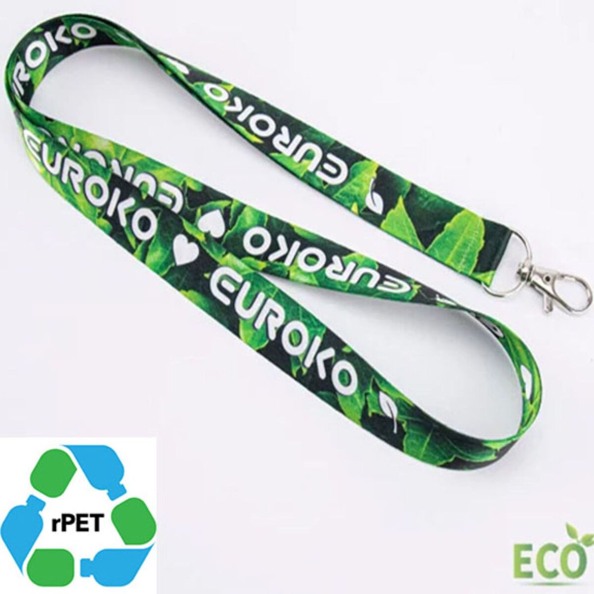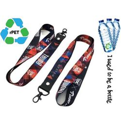 rPET sublimation lanyard with Lobster Claw offers a near perfect balance of high performance product and a great low price. These are our most popular style of customized rPET recycled ID Products and feature top-quality material along with an imprint of your logo. Made from rPET recycled polyester sublimation material, this lanyard is not only eco-friendly, but also durable and long-lasting. Available in 2 different widths (5/8", 3/4" wide), and your choice of a J-hook, keyring, bulldog or lobster claw is included. Order this Recycled Eco-friendly Lanyard today with your logo and get them shipped to your clients with low FLAT Shipping charge!